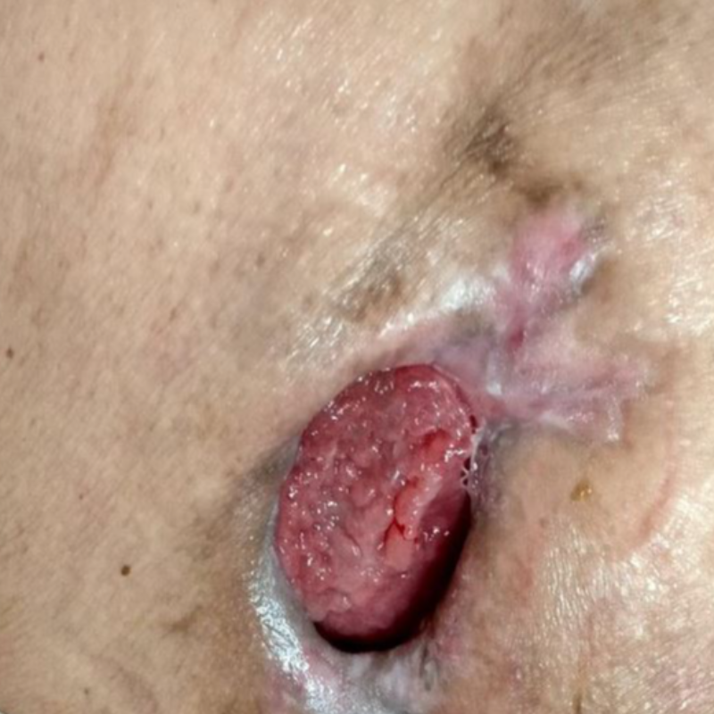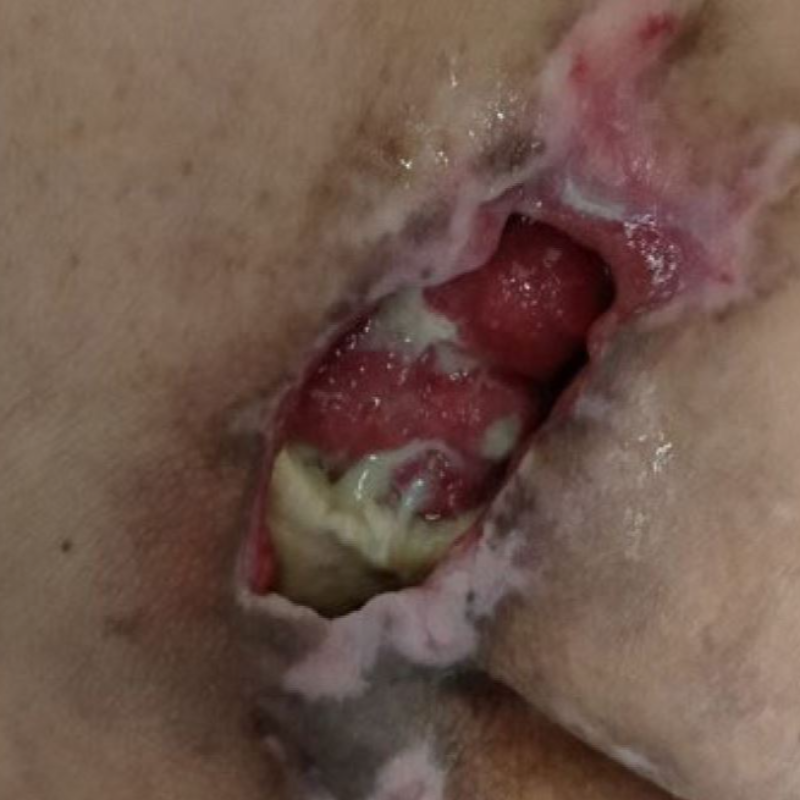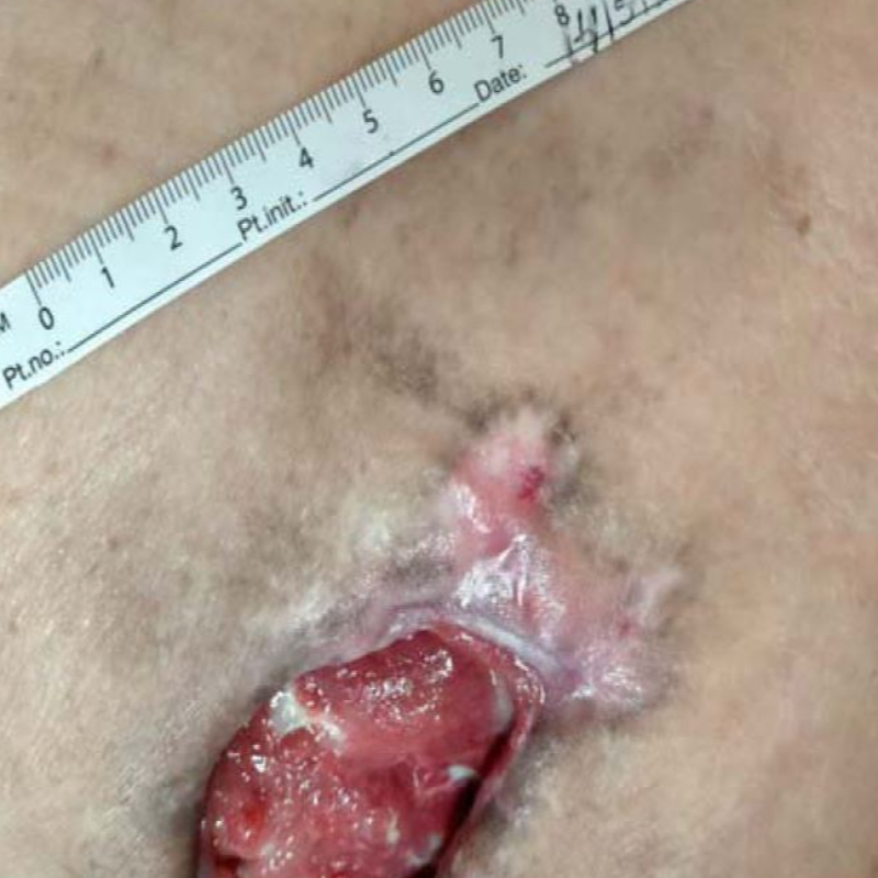 Día 9 (14/05/21): Curas cada 48 horas llegando incluso, en algún momento, a curas cada 72 horas. Día 50 (24/06/21): Se observa hipergranulación del lecho y un aumento del exudado, por lo que se pauta tratamiento ATB y se aplica Biatain® Alginate Ag y Biatain® Silicone Sacro, manteniendo curas cada 48 horas. Además, se aplican toques de nitrato de plata en las dos siguientes curas. Durante el verano, se continúa el tratamiento inicial (Biatain® Fiber, Biatain® Silicone Sacro y PBNI). Día 132 (13/09/21): Toques de nitrato de plata (durante esa cura por hipergranulación), Biatain® Fiber (se introduce en cavidad) y Biatain® Silicone Sacro.